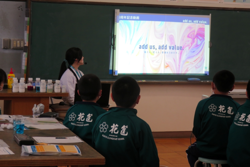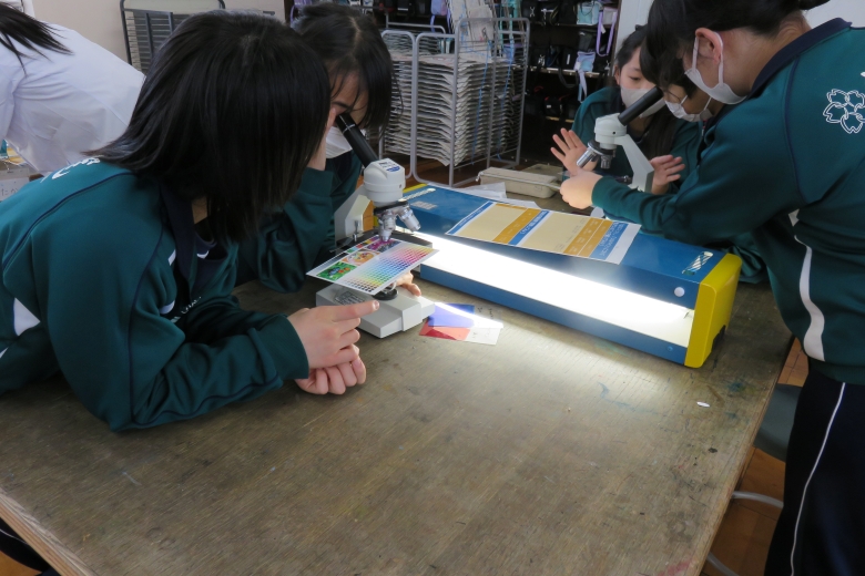 水やインクに当社製品オルフィンを加える実験や、顕微鏡を使ってお菓子の袋の印刷面を観察する体験としました。